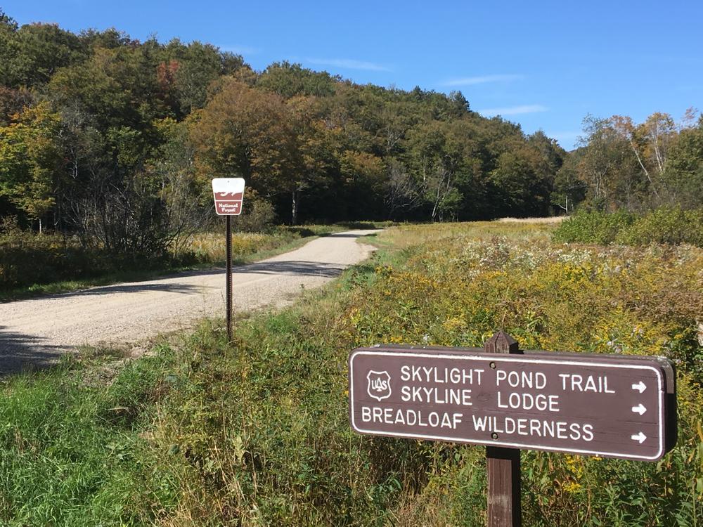 The straightforward 2.3 mile climb from Steam Mill Clearing to the Long Trail junction near Skylight Pond begins on a docile track that passes a registration box after 100 yards then doubles that distance to meet a bend in a woodland stream. Soon swinging right to cross the flow, the trail bears southeast, spans a larger brook on a hiker's bridge 0.2 miles from the trailhead, and remains almost level until it jumps the first of several seasonal streams. A moderate ascent soon carries hikers into the Breadloaf Wilderness, a 21,000 acre preserve that envelops the Long Trail from VT-125 nearly to Lincoln Gap. Changing course only to avoid gullies and maintain a steady gait, the trail wiggles east with an escalating number of twists and turns that correspond to the gradual increase in pitch. Climbing muscles feel well used by the time the path rolls onto the top of the rounded ridge and cross the Long Trail in a shallow col between Battell and Bread Loaf mountains.