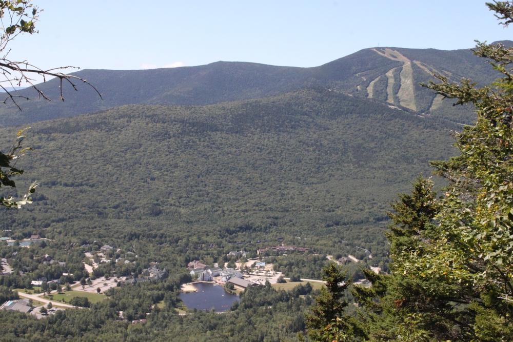 Descend past a great view of the village of Waterville Valley and on to the trail exit in the driveway of #76 on Snows Mountain Road. To return to the parking lot, walk down the paved road then turn right on the Boulder Path Road sidewalk past the tennis courts back to the parking lot.