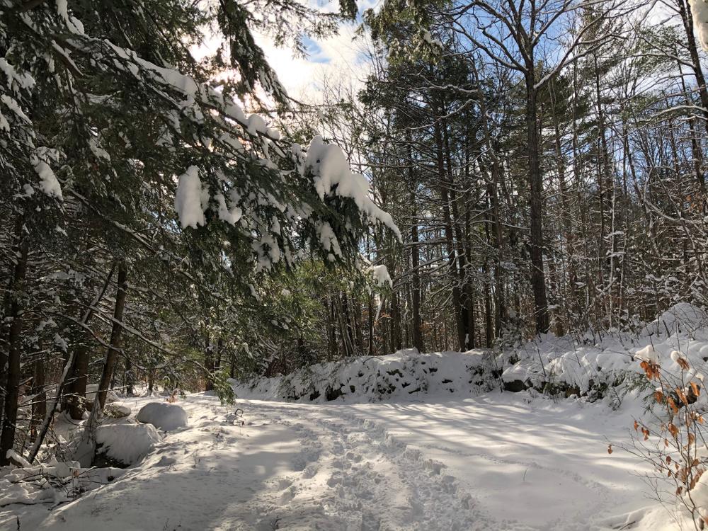 Locke Trail - The longest trail on the property, the Locke Trail leads from Marsh road, passes the parking area at Stonehouse Pond, leads to the Ledges Loop Trail, continues across private land (please respect the private landowners who allow this trail to pass through their property), connects to the Overlook Trail, Brook Trail, and South Trail before leading off the property onto private land.