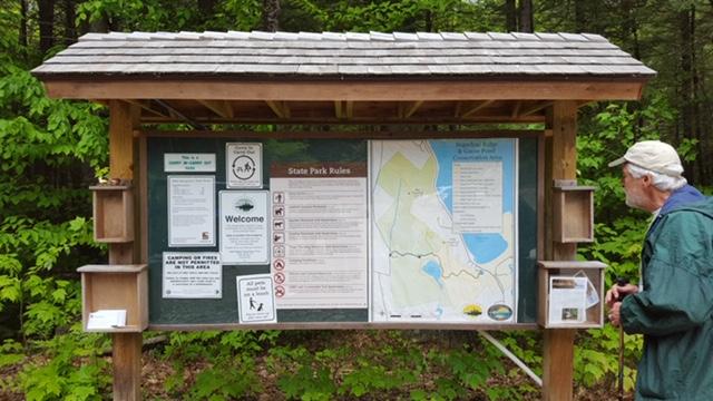 Note that the White Trail was relocated in 2018 so the southern end of the trail now intersects the Snowmobile Trail east of the kiosk as shown here. The kiosk maps and online map show the old location.