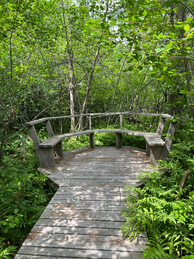 This leisurely walk crosses a boardwalk and ascends westward gently in a loop through woods behind the Unitarian Universalist Church on Route 5. Park in the church parking lot and follow the wooden sign pointing to the Spirit in Nature Path, across the backyard. You’ll see a kiosk and blue tool shed at the trailhead. A boardwalk crosses over a fen with many wetland species. You’ll find a circle of benches for a small group to sit in a shady spur of the boardwalk. Turn right at the end of the boardwalk and follow orange and yellow square trail markers to the woodland loop. You can rest on a bench at the high point of the trail.
