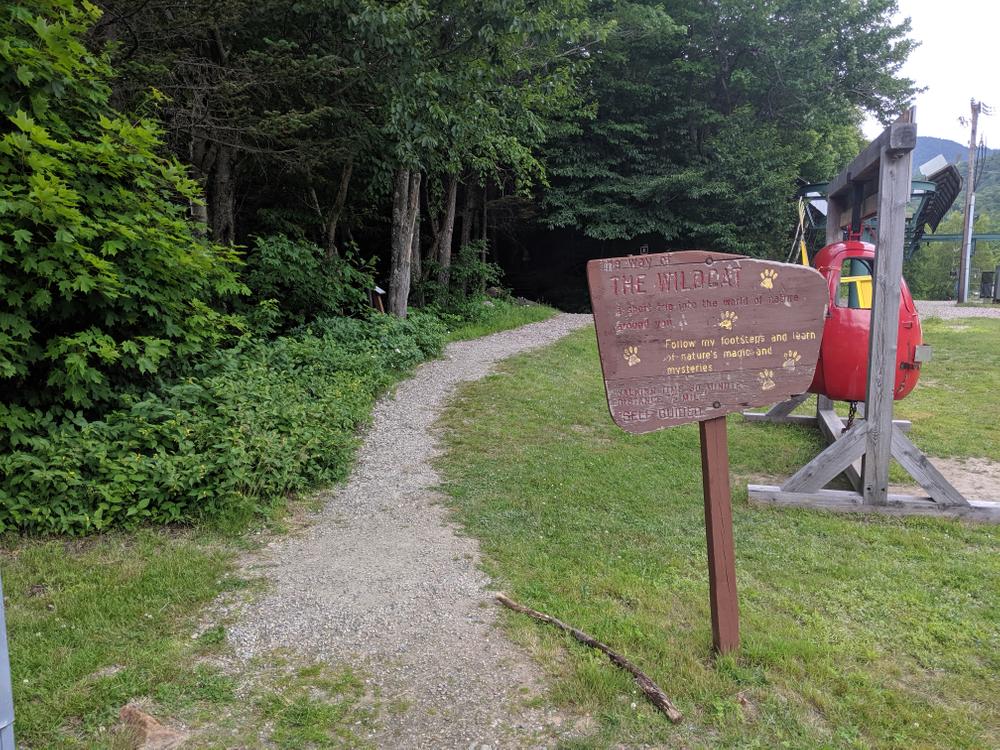 To get to the trailhead, use the boardwalk to walk around the ski lodge. Turn left. The Thompson Falls Trailhead starts in the trees on the left and coincides with the Way of the Wildcat Nature Trail.