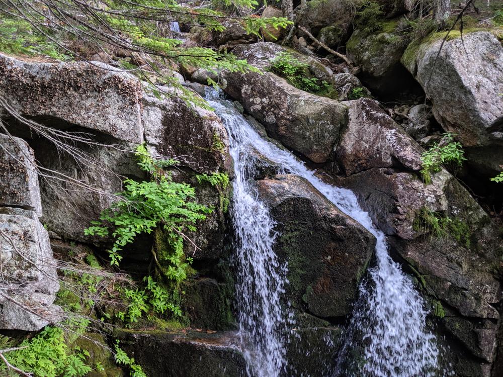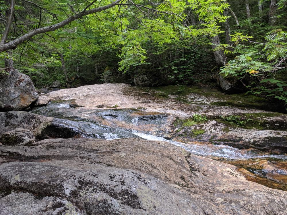 The trail continues up a steep granite face then crosses the brook before continuing upward. Pay close attention to the yellow blazes designating the trail as it is easy to lose the trail as it crosses the brook. The trail follows along Thompson Brook as it creates a series of cascades and rapids for the next 0.1 mile to the point where the trail ends. This section of trail is much steeper than the rest of the trail.