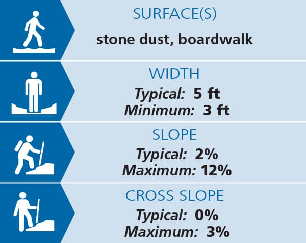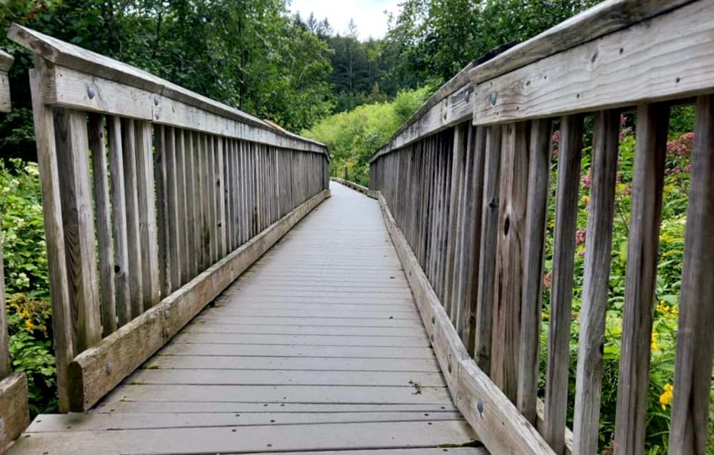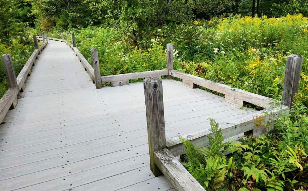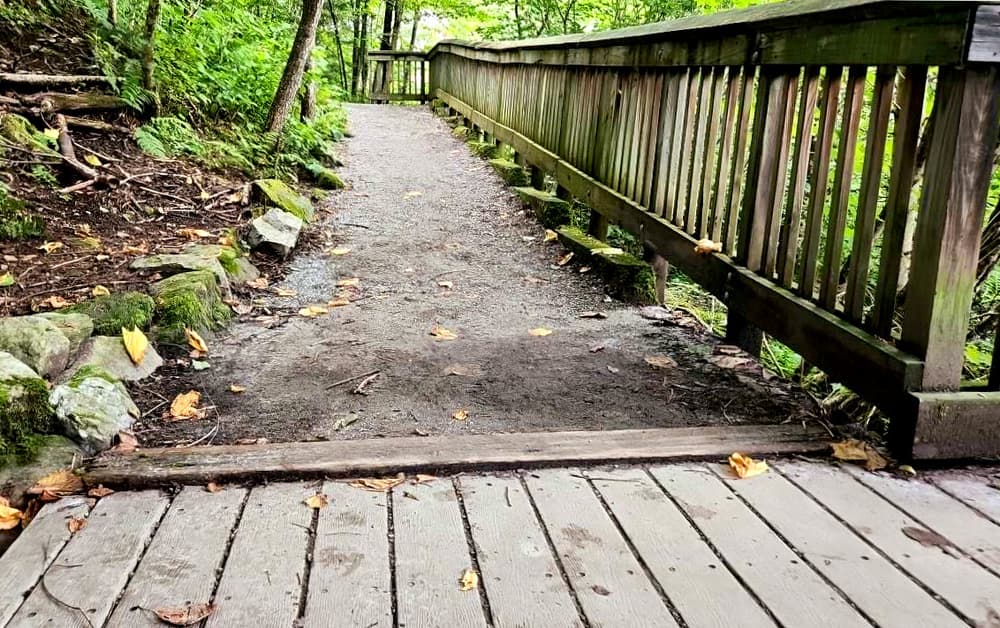 From the River Road parking area, this trail along a portion of the Appalachian Trail (AT) travels to Thundering Falls along a 900-foot, approximately 3-5-foot wide, boardwalk and stone dust path built by the Green Mountain Club. The boardwalk crosses over the Ottauquechee River and through the open Ottauquechee River floodplain. The trail then ascends to a viewing platform overlooking the Falls via a relatively accessible switchback and spur trail built by the Vermont Youth Conservation Corps. Most of the trail has a slope of approximately 2% with the steepest short sections being 12%. There is very little cross slope for the duration of the trail from River Road to the falls. Multiple pullouts allow folks to rest before and after the steeper sections. See Trail Access Information below for more information about this trail.