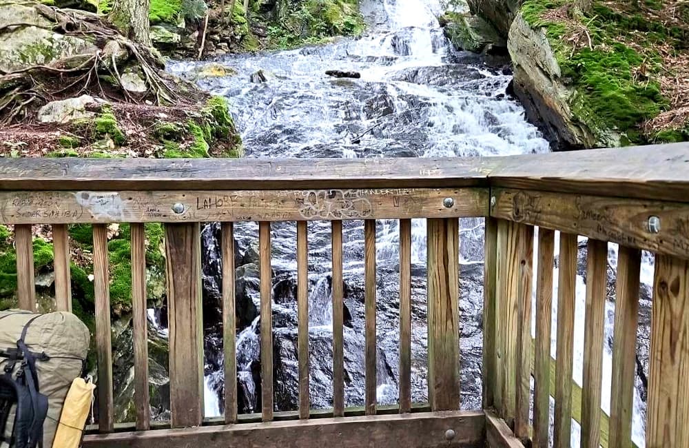 Thundering Falls is said to be the sixth tallest waterfall in Vermont. It is part of Kent Brook which flows out of Kent Pond just north of where the AT and the Long Trail split. At high water it is a magnificent cascade as the stream tumbles 140 feet through a steep and narrow cataract. The falls are also the site of a historic mill powered by the energy of the falling water.