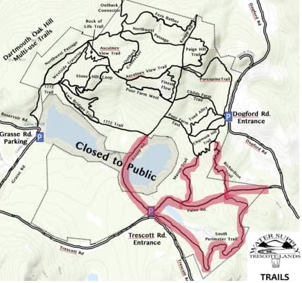 The Trescott Company owns 1,165 acres here in the upper watershed of Camp Brook. The Company was established in 2010, and is an equal partnership between the Town of Hanover and Dartmouth College. The Town of Hanover separately owns 178 acres containing the reservoirs and water filtration plant, all of which are closed to the public.