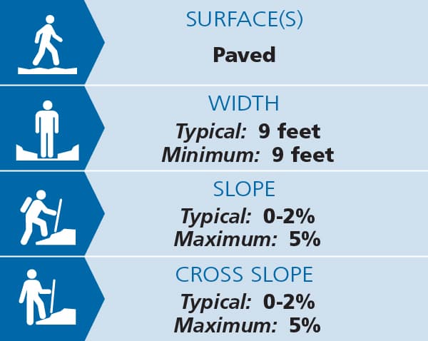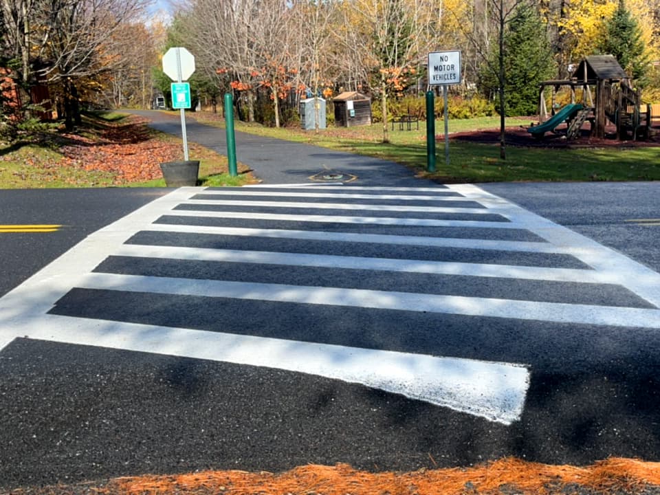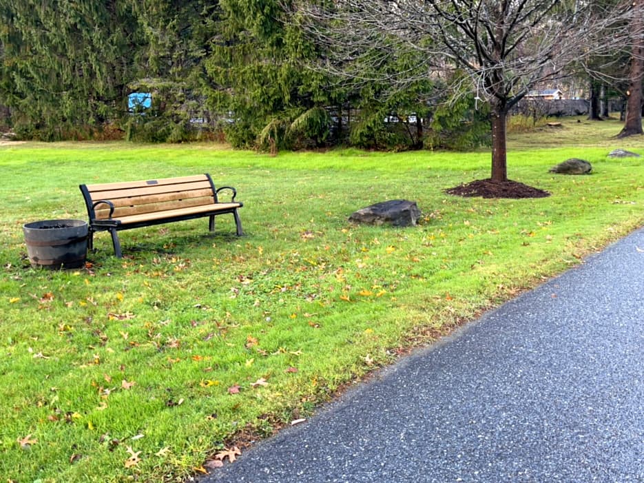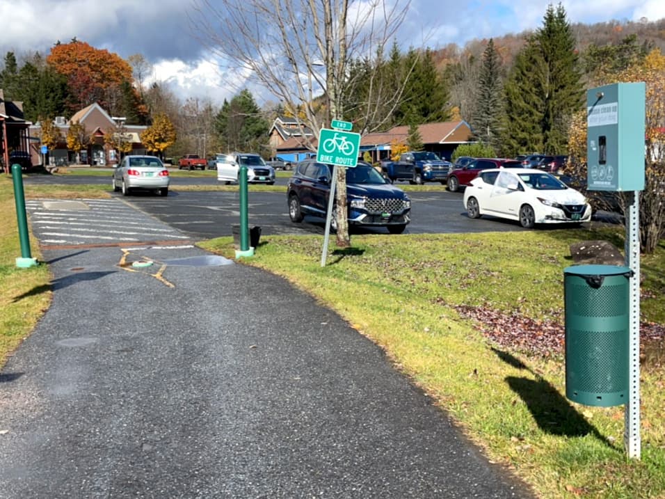 This section of the Valley Trail, which is near Route 100 in West Dover, is a 0.73-mile paved multi-use pathway. It is an accessible trail and suitable for walking, jogging, biking, wheelchairs, and strollers. It is mostly flat. The maximum grade is 5%, and typical cross slope is 0-2% with a paved treadway width of 9 feet. There are frequent benches and multiple parking lots along the trail.