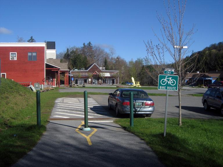 Mountain Park Plaza: Access to the north (or east) end of the trail is the parking lot for the Mountain Park Plaza (911 address is approximately 209 Route 100, West Dover, VT). The trail starts at the far left corner of the parking lot. Mountain Park Plaza contains the post office and a movie theater. It is 1.6 miles south of the south access road to Mount Snow Ski Area, and 6.8 miles north of the intersection of Route 9 and 100 in downtown Wilmington.