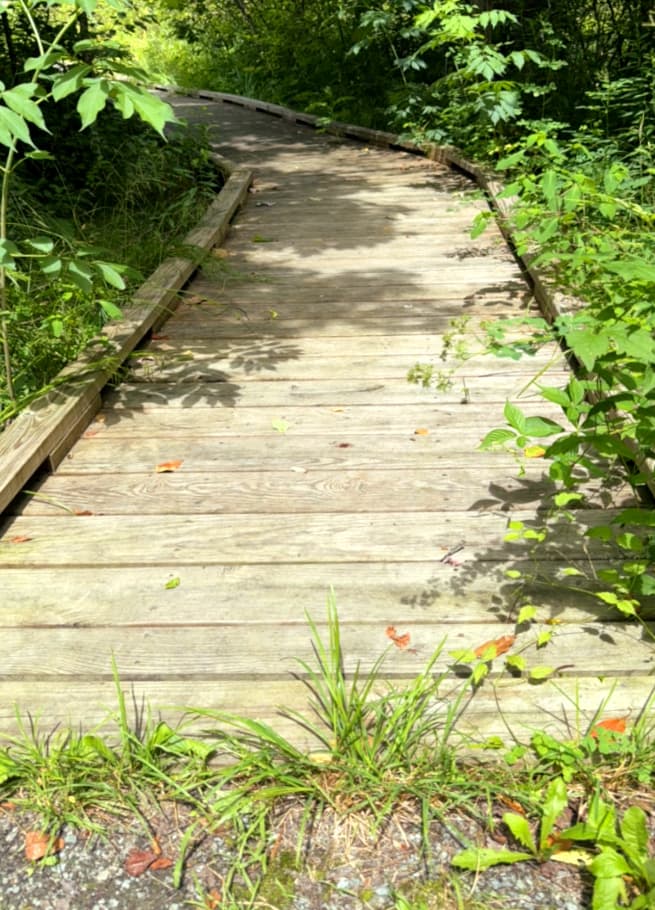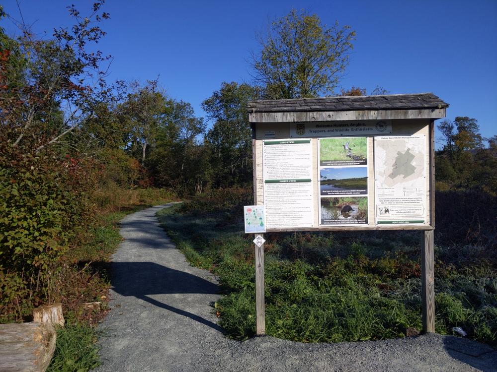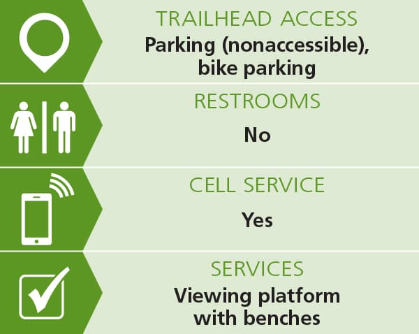 A universal access trail at Damon's Crossing leads to an accessible wildlife viewing platform with views of wetlands as well as the surrounding landscape. The trail is 0.15 miles each way, 4+ feet wide and the surface is compacted stone with some sections of boardwalk. The trail reaches a 12% slope a few times along its length but cross slopes are minimal. The viewing platform has benches. See Trail Access Information below for more information about this Accessible Experience.