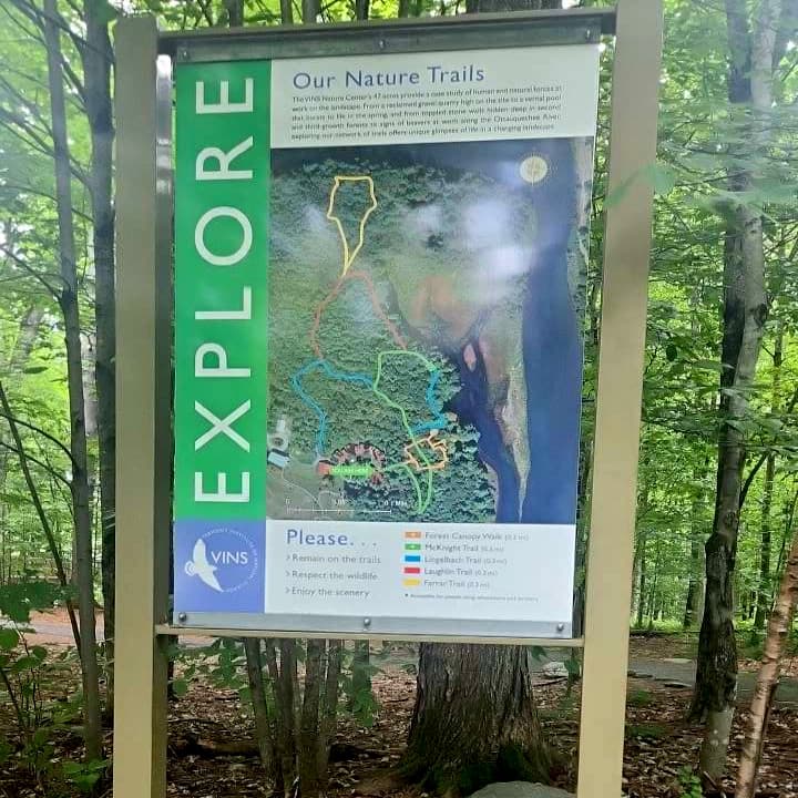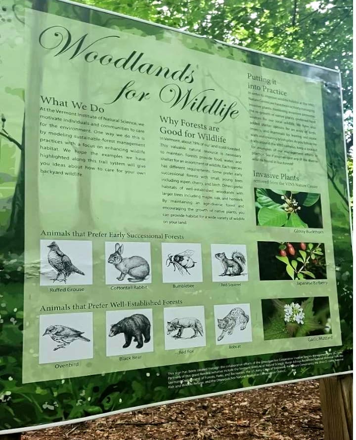 A series of short walks through 40 wooded acres of VINS forest with views of the Ottauquechee River and information kiosks along the way. An interpretive hand-out that covers the changing landscape of Vermont can be obtained at the trailhead.