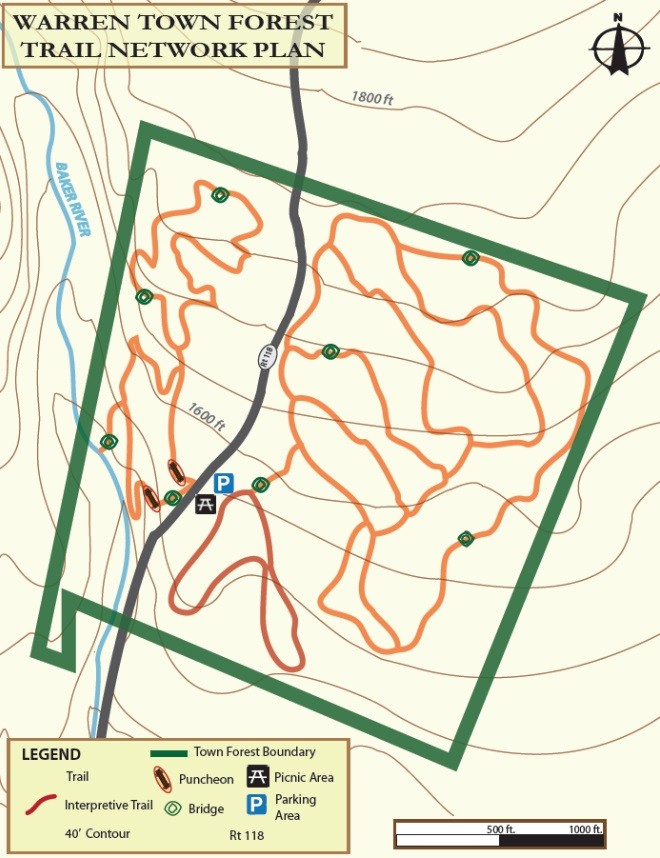 The Warren Town Forest was donated to the Town of Warren, NH by the McVetty family. Managed as a wood lot for decades, the town recently partnered with Hermit Woods Trailbuilders, LLC to install a comprehensive trail system on the 120-acre parcel. Trails are open to all types of non-motorized activity including walking and hiking, mountain biking and skiing and snowshoeing in the winter. All uses are permitted on all trails. However, some trails were designed with certain uses in mind: examine the map for more details. Further historical information on the parcel and surrounding landscape is available on a series of informational panels staggered along two trails: Park's Railroad and Bridle Path.