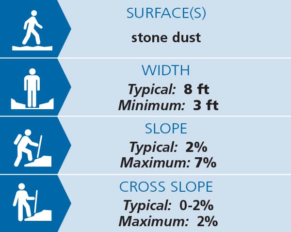 Please note: as of August 2024, recent erosion had caused surface roughness and some small areas of steeper cross slopes.