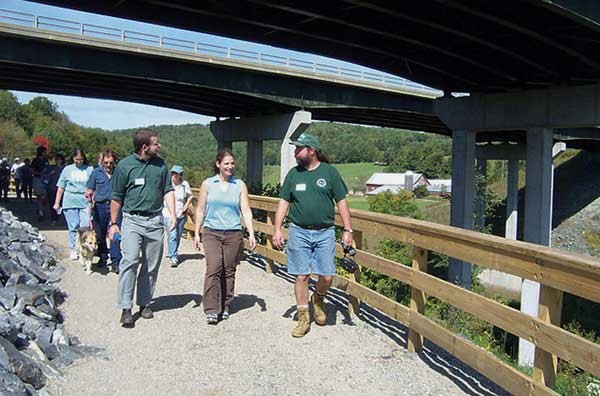 This section of the Cross Vermont Trail on the former railbed is a pleasant, gradual trail through stands of large trees with some sweeping views of Wells River, wetlands, and farms beyond. Wildlife viewing opportunities reward the quiet trail user. Together with the Boltonville Nature Trail and the Blue Mountain Nature Trail, there is a network of nearly four miles throughout the Wells River Conservation Area (including properties of the Al-len Farm, State of Vermont, Town of Newbury, and Blue Mountain Union School.)